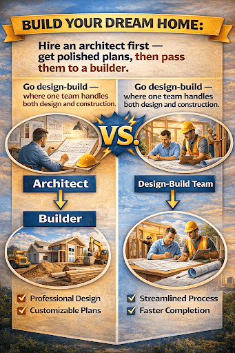 Hire an architect first – get polished plans, then pass them to a builder.