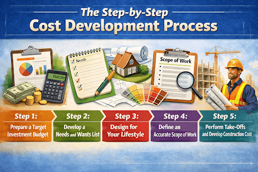 This is the starting point – not the final number. Think of it as a feasibility check. Learn more about the full home remodeling process at Marwood Construction.